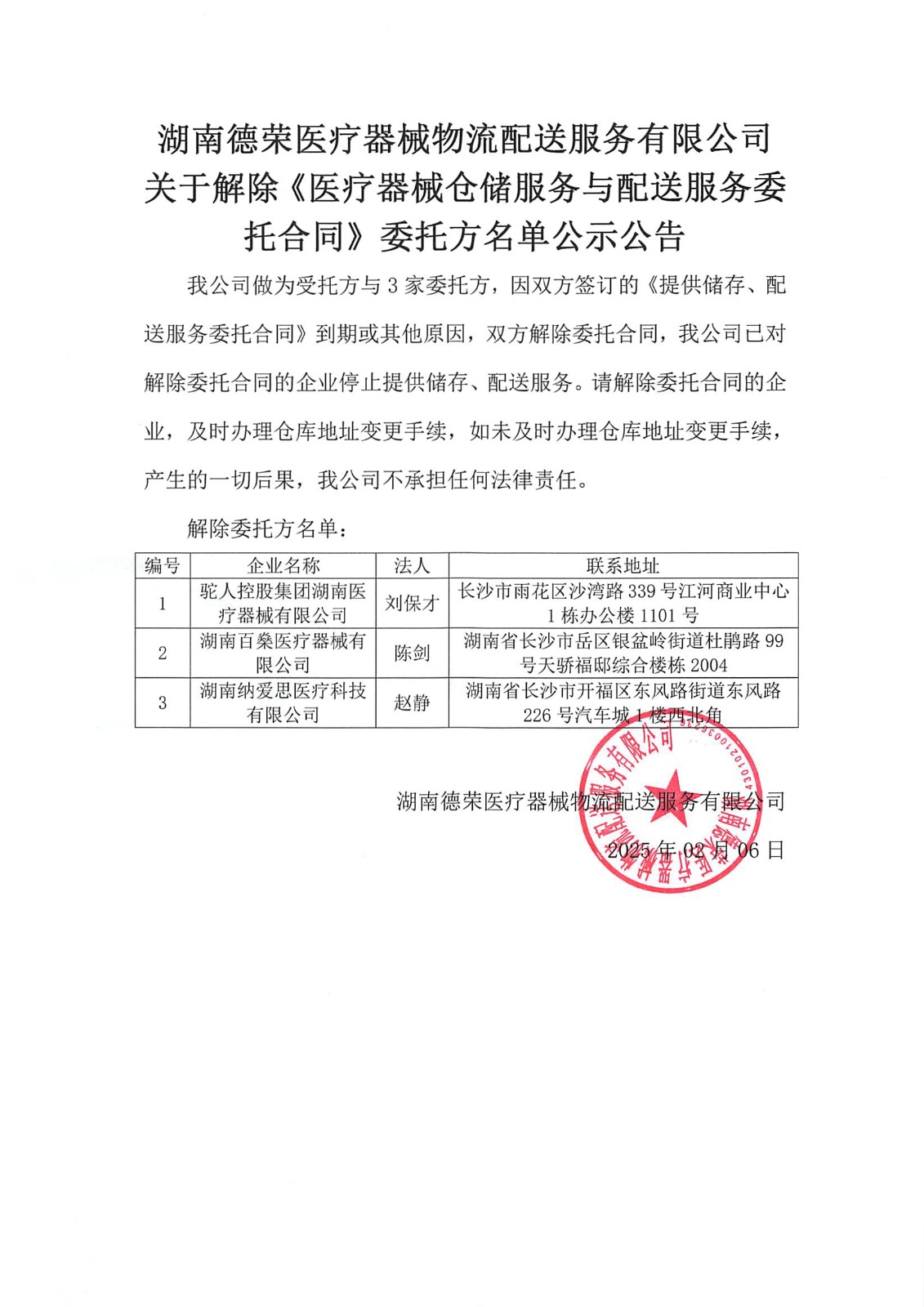 关于解除《医疗器械仓储服务与配送服务委托合同》委托方名单公示公告